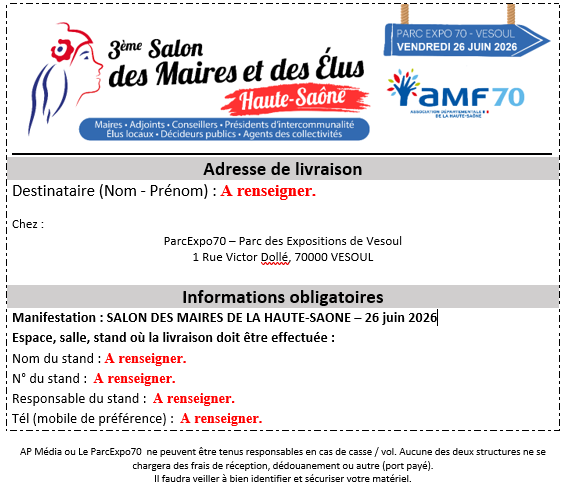 AP Média ou Le ParcExpo70 ne peuvent être tenus responsables en cas de casse / vol. Aucune des deux structures ne se chargera des frais de réception, dédouanement ou autre (port payé).